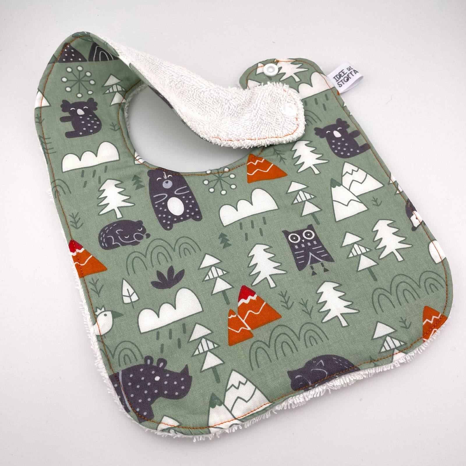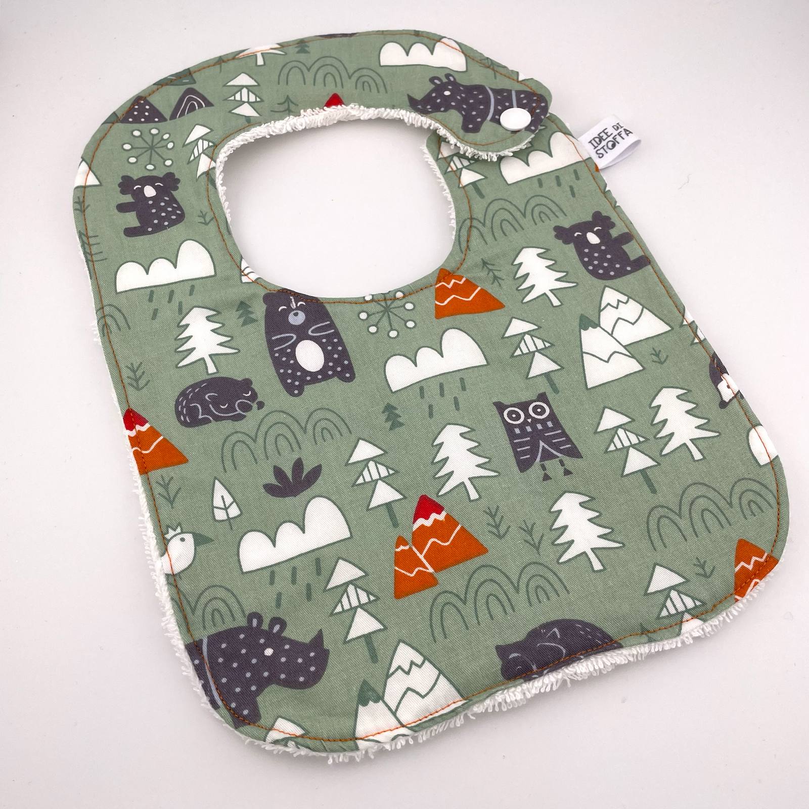 Bavaglino 100% cotone, fronte tessuto stampato, retro spugna di cotone bianca.