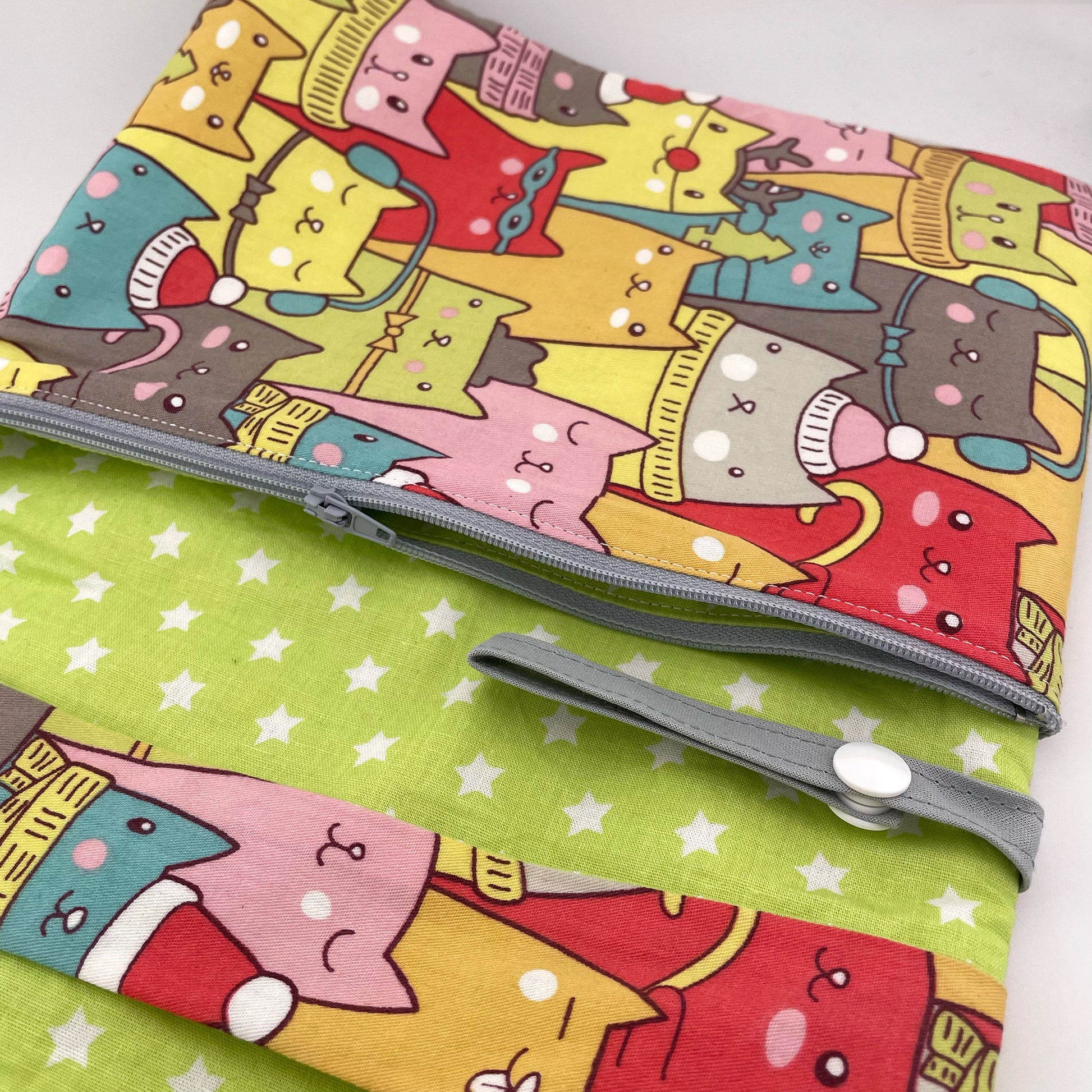 Questo pratico multitasca portapannolini ha uno scomparto per le salviette umidificate, asola portaciuccio (che eventualmente può essere usata per attaccare il multitasca al passeggino), tasca con cerniera per un cambio e tasca libera per pannolini. Perfetto per portare con sè tutto il necessario per il cambio del tuo bambino in ogni occasione. La chiusura è con bottone automatico ed è realizzato completamente a mano in cotone leggermente imbottito.