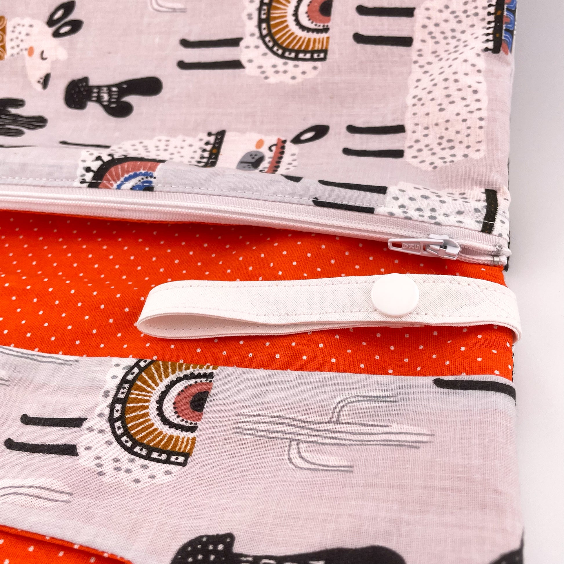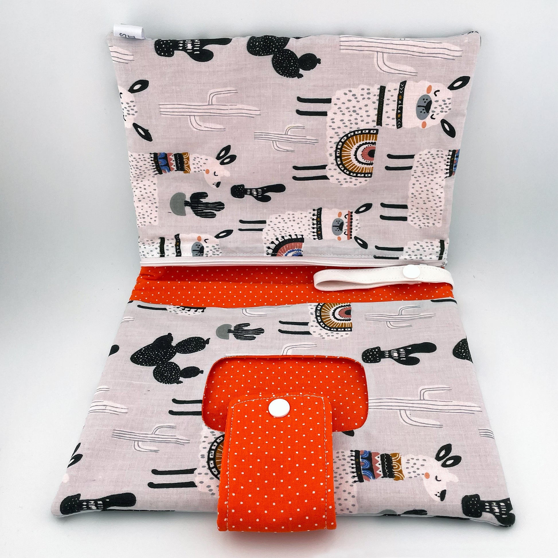 Questo pratico multitasca portapannolini ha uno scomparto per le salviette umidificate, asola portaciuccio (che eventualmente può essere usata per attaccare il multitasca al passeggino), tasca con cerniera per un cambio e tasca libera per pannolini. Perfetto per portare con sè tutto il necessario per il cambio del tuo bambino in ogni occasione. La chiusura è con bottone automatico ed è realizzato completamente a mano in cotone leggermente imbottito.