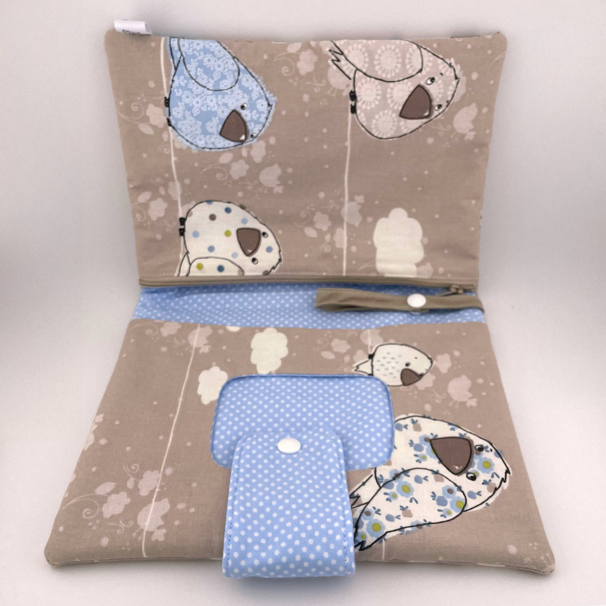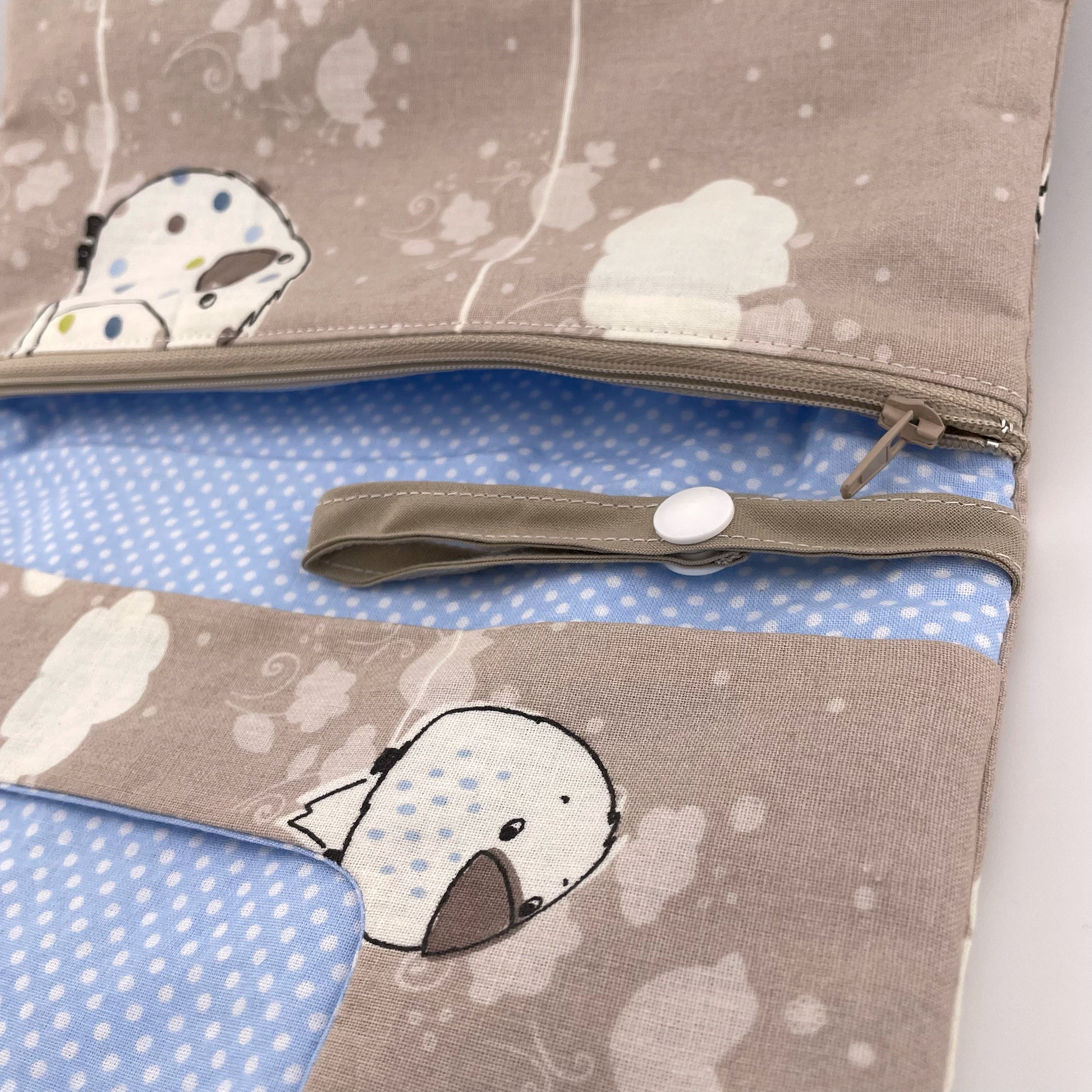 Questo pratico multitasca portapannolini ha uno scomparto per le salviette umidificate, asola portaciuccio (che eventualmente può essere usata per attaccare il multitasca al passeggino), tasca con cerniera per un cambio e tasca libera per pannolini. Perfetto per portare con sè tutto il necessario per il cambio del tuo bambino in ogni occasione. La chiusura è con bottone automatico ed è realizzato completamente a mano in cotone leggermente imbottito.