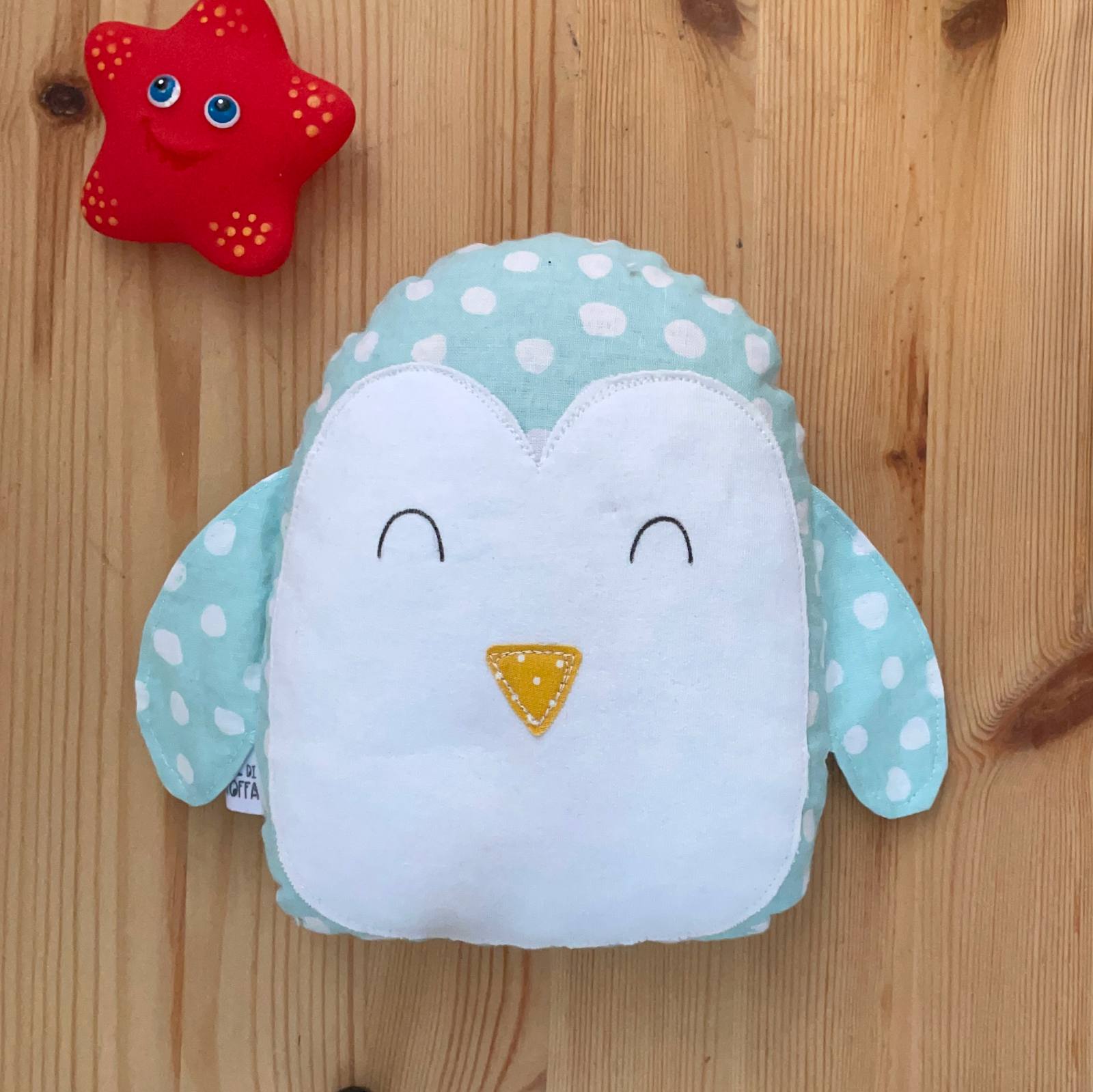 Simpatico pinguino imbottito con la pula di farro e adatto ad essere riscaldato o raffreddato secondo la necessità. Il cuscino caldo è adatto per dare sollievo al pancino e anche per riscaldare il lettino o la culla anche per alleviare le colichette. Il pinguino è fatto completamente a mano, in cotone fantasia. La pula di farro al suo interno lo rende morbido ed è un materiale naturale.