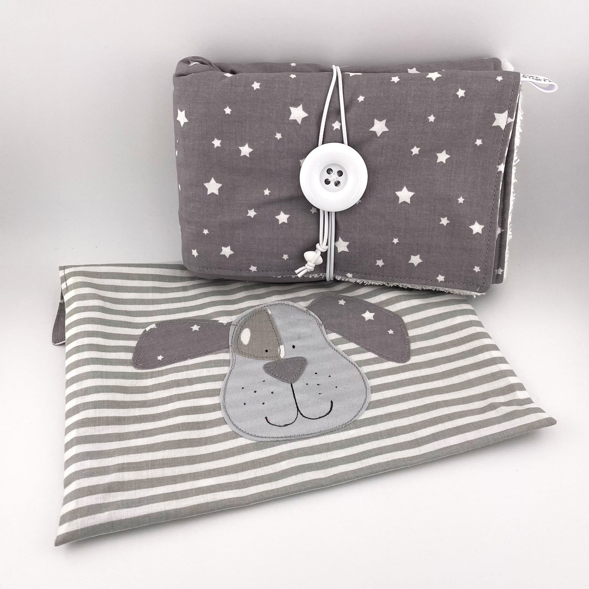 Set cambio da viaggio per neonato, composto da bustina porta salviette e tappetino per il cambio, con due taschine porta pannolini. Le bustine porta pannolini/salviette sono multitasca. Entrambi personalizzati con disegni.