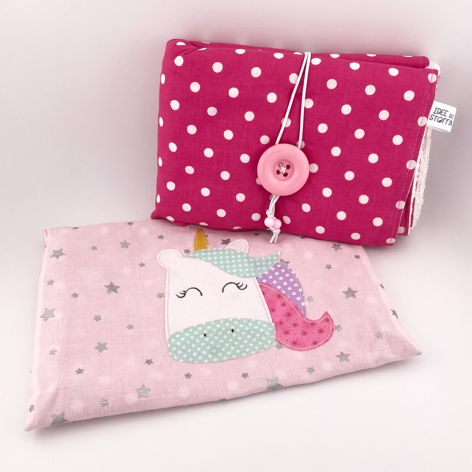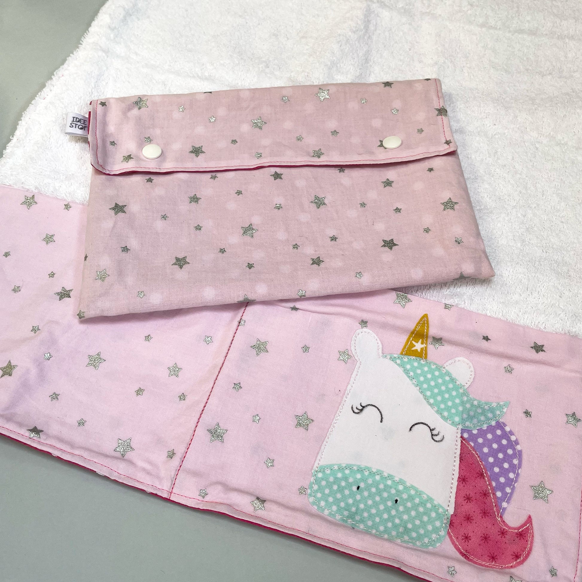 Set cambio da viaggio per neonato, composto da bustina porta salviette e tappetino per il cambio, con due taschine porta pannolini. Le bustine porta pannolini/salviette sono multitasca. Entrambi personalizzati con disegni.