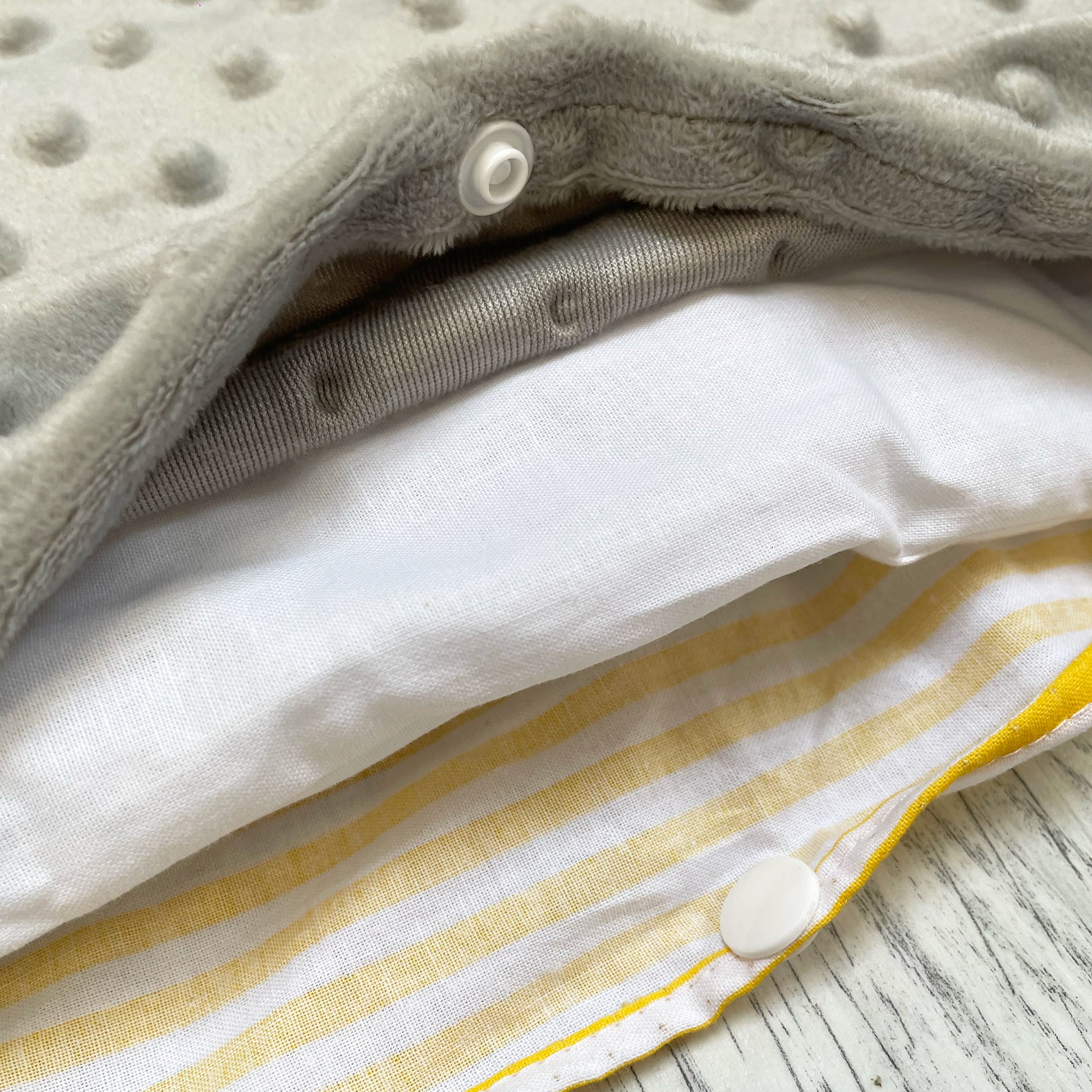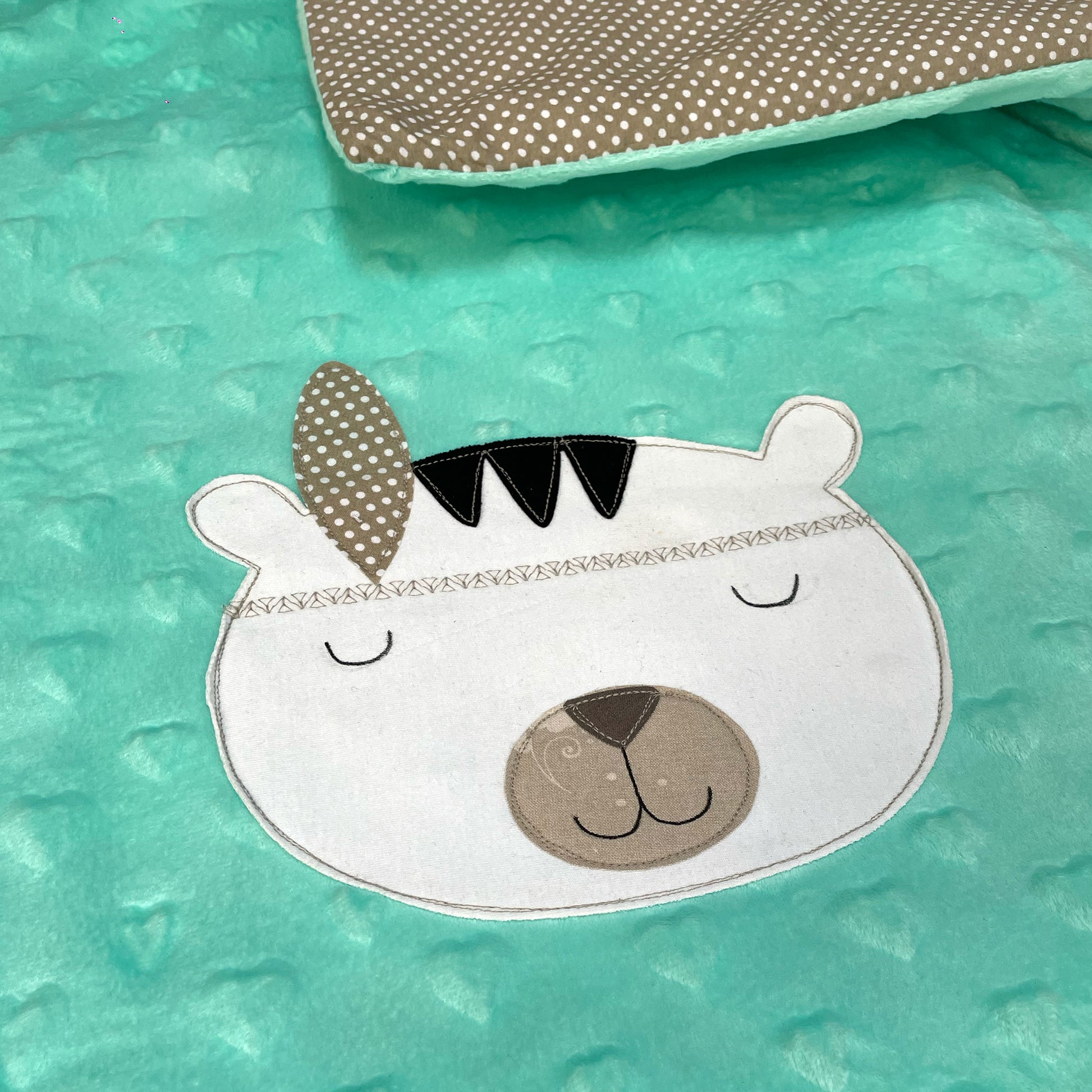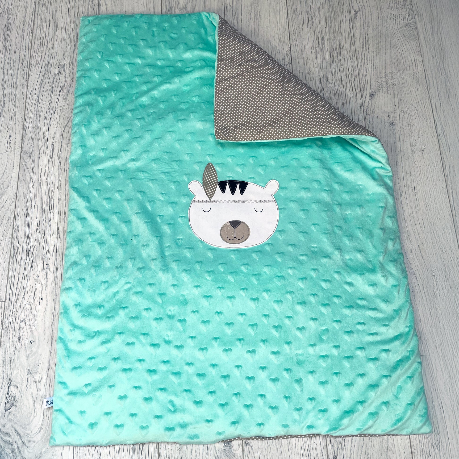 Caldo trapuntino imbottito sfoderabile, utilizzabile quindi 4 stagioni, realizzato da un lato in tessuto cotone minky con disegno applicato e dell'altro in cotone fantasia. Perfetto per lettino, passeggino, divano, da tenere in macchina o anche come soffice tappeto per giocare a terra.